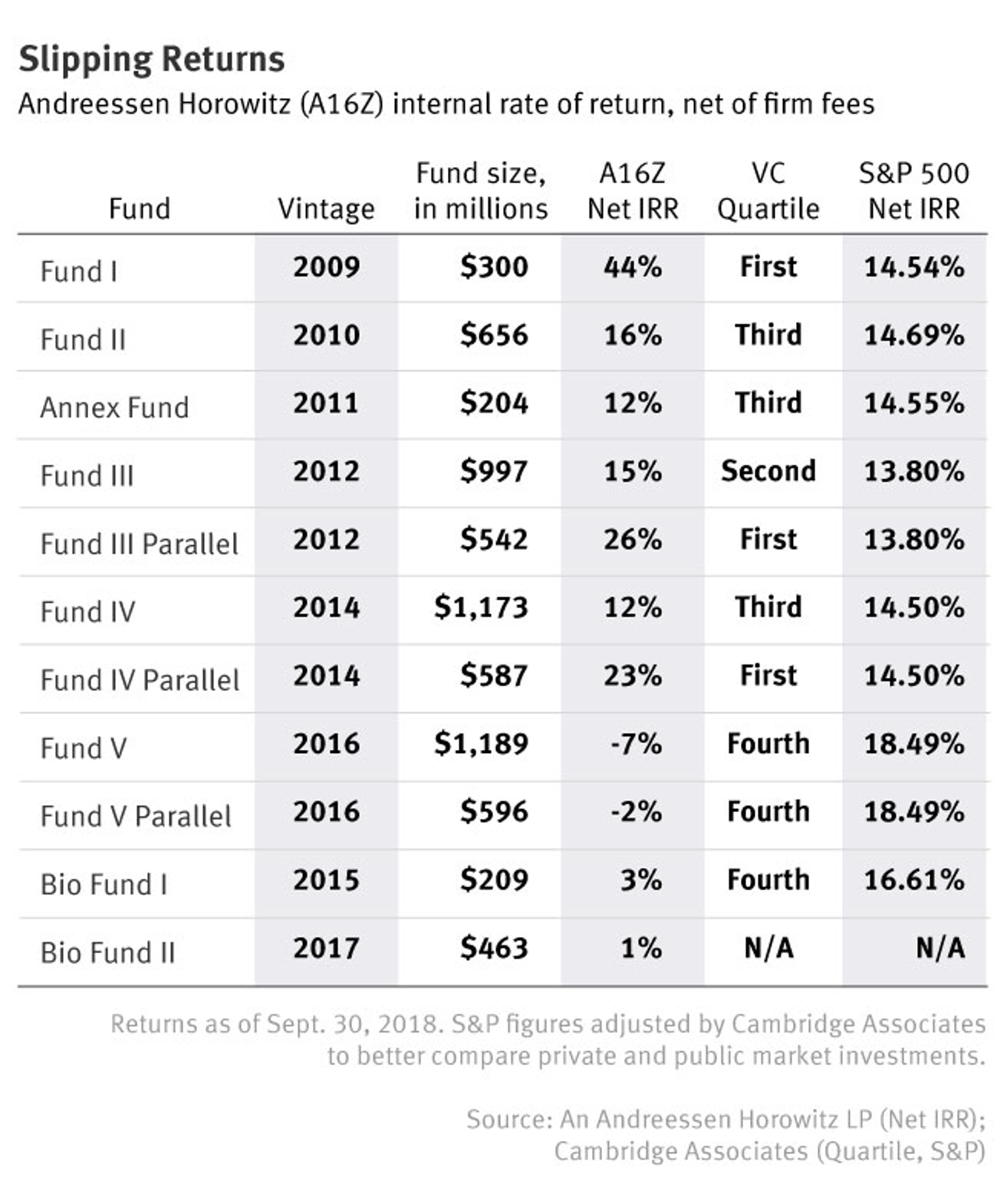 - a16z는 창립 후 처음 결성한 펀드(Fund I)에서 투자한 Skype가 불과 2년만인 2011년 Microsoft에게 $8.5B에 매각되면서 화려하게 데뷔합니다. 그러나 이후 펀드들의 실망스러운 실적이 공개되면서 많은 비판을 받기도 했죠. 2019년 a16z의 LP 중 하나가 제공한 내부 자료에 따르면, 펀드 대부분이 S&P 500과 비슷하거나 그마저도 못 미치는 성과를 보였습니다. (물론 이후 소위 대박 난 딜들도 있는데요, 대표적으로 Coinbase IPO를 통해 VC가 단일 회사로부터 거두어들인 최대 수익을 달성하기도 했습니다.)