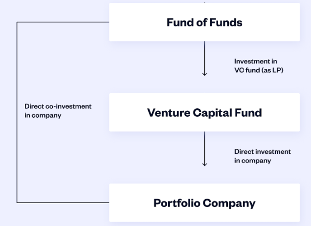 산업을 가장 잘 이해하는 심사역이 직접 좋은 회사를 골라 유니콘이 되는 과정을 함께 한다. 하지만 그 과정이 너무 멀고 험난해서 30개의 계란이 전부 배달되어 유니콘이 되진 않는다. 후원자 입장에선 한 명의 배달원만 고르지 않아도 되듯, 투자자 또한 여러곳의 VC에게 투자를 할 수 있다. 하지만 VC Fund에 출자하여 LP로 참여하기엔 현실적으로 최소 출자 자금 등의 진입장벽이 있으므로, 아래 이미지에서 보이는 구조와 같이 Fund를 구성하여 VC Fund의 LP로 참여한다. 이를 Fund of funds(재간접 펀드. 이하, "FoF')라고 한다.