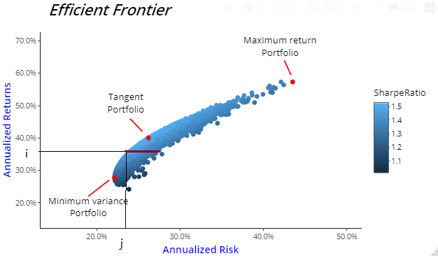 투자관점에서 보면 High Risk, High Return이라는 말이 틀리지 않지만 우리는 자본 배치의 효율성 관점과 기회비용 및 위험분산 정도를 관리해야한다. 결국 변동성은 최대한 줄이면서 원하는 기대수익률을 설정하는 최적의 spot을 찾아야하는데 이는 Efficient frontier(효율적 투자선)을 통해 유추해볼 수 있다. 변동성과 수익률의 함수를 통해 Sharpe Ratio를 산출하는데, 변동성이 낮아 어느정도 예측가능하면서 원하는 수익률을 얻고 싶다면 Risk-Return을 고려하여 위의 효율적 투자선에서의 최적점이 어디쯤 일지를 고민하는 것이 필요하다.