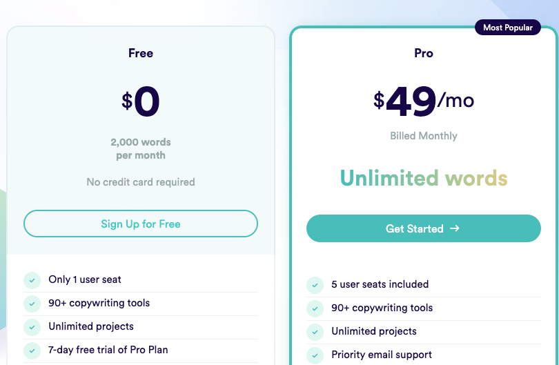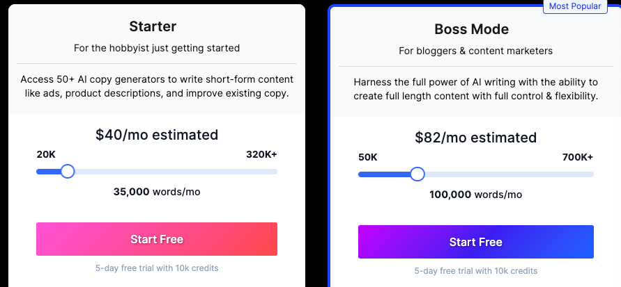 GPT-3의 기본 요금제는 아래와 같은데 1,000토큰은 750 단어정도로 보시면 된다고 합니다. 역산하자면 35000단어를 제공해주는 Jasper의 GPT 비용은 0.93달러이고 본인들은 40달러를 받습니다. 원가율이 약 2.3%의 비즈니스입니다. 물론 개똥 계산인건 알지만 그만큼 차이가 크다는 것을 볼 수 있습니다.