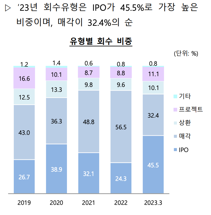 국내 벤처투자 생태계에서 IPO를 통한 회수가 가장 비중이 높습니다.