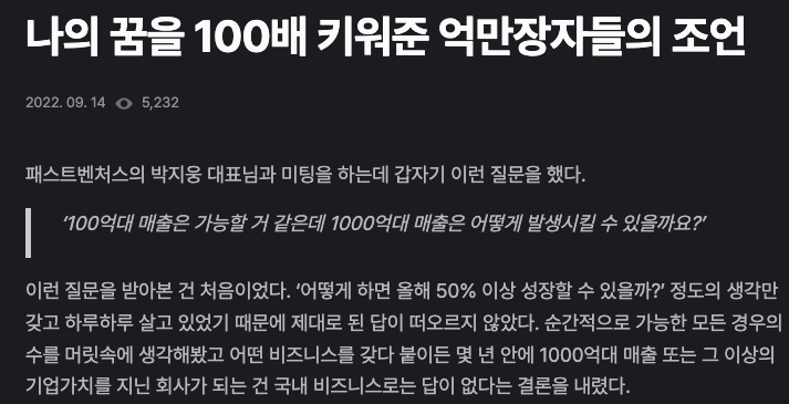 어차피 무모한 꿈을 꾸는 스타트업 대표들은 당연하게도 큰 목표, 큰 꿈을 갖고 시작해하는 것이 유리합니다.