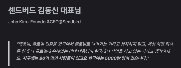 또 저희가 갖는 사고의 편협함을 뒤집어 주는 좋은 말이 있어 따왔습니다. 우리는 왜 해외 진출을 해야할까요? 그것은 우리가 스스로 국내와 해외를 마음속으로 나누고 있기 때문입니다.