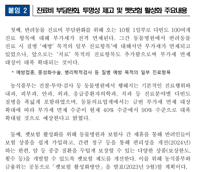 반려동물 관련 산업의 성장과 트랜드는 정부에서도 인지하여 적극 육성하려는 움직임이 이어지고 있습니다. 그 중에서도 수가 산정의 어려움 등으로 아직 활성화가 되지 못한 펫보험 분야에서도 진료비 부담완화 및 제도 개선에 대한 시도가 시작되고 있습니다.