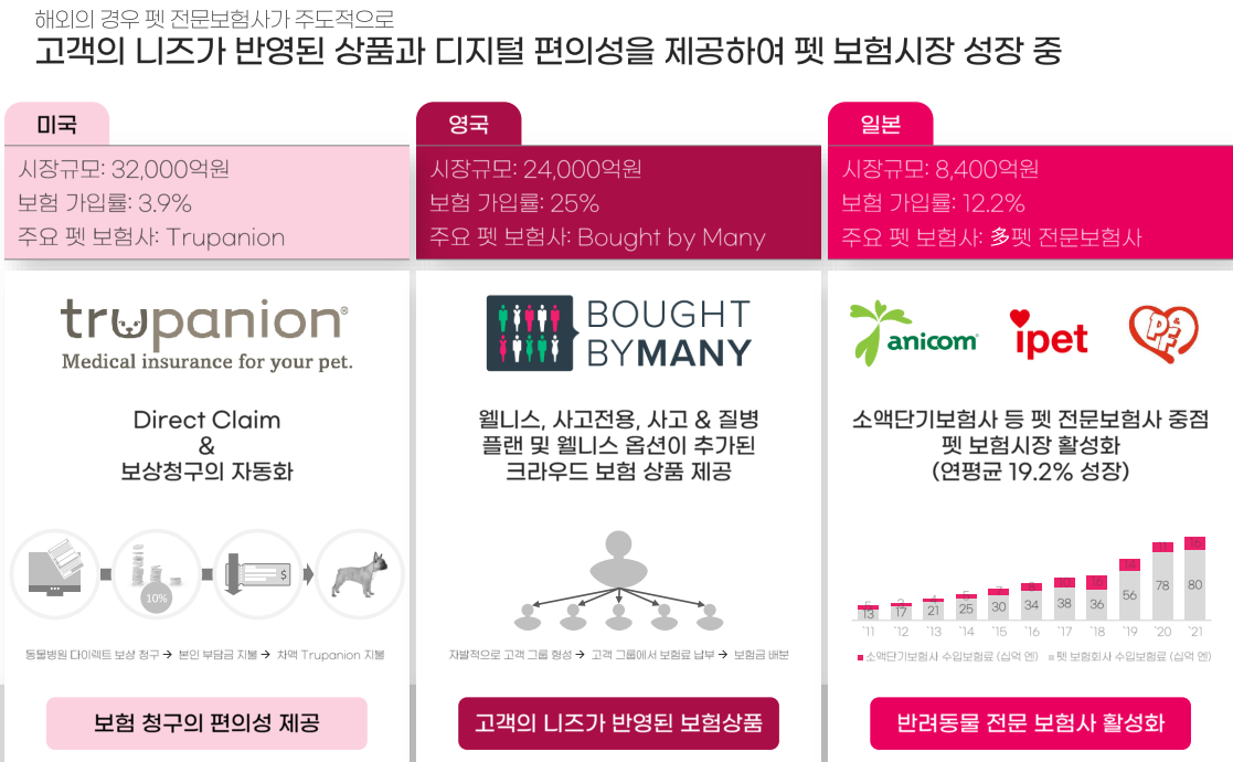 미국의 Trupanion과 일본의 Anicom의 펫보험 사례를 대표적으로 꼽을 수 있습니다.